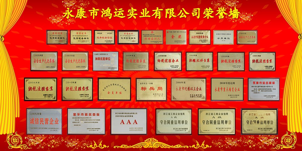 鸿运实业有限公司属于永康市骨干企业、浙江省成长之星企业。连续多年被评为“劳动信得过单位”、“纳税优胜企业”、“安全生产先进单位”、“重合同守信用单位”。2011年通过高新技术企业认定,当年还被评为科技进步企业和科技型中小企业。